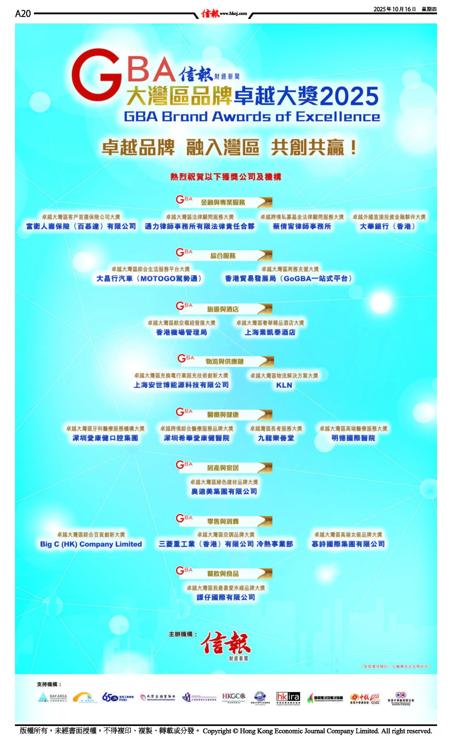 蔡倩甯律師事務所榮獲《信報》「大灣區品牌卓越大獎2025」— 金融與專業服務類別-卓越跨境私募基金法律顧問服務大獎!